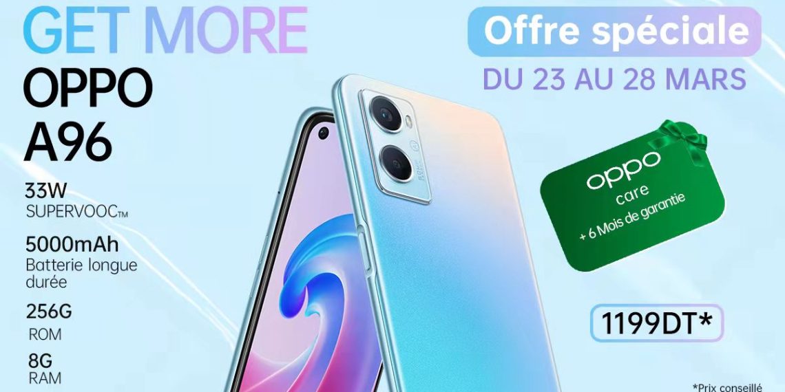 Tunisie, 23 mars 2022 – OPPO vient d’annoncer que son nouveau smartphone A96 est actuellement disponible sur le marché tunisien sous le slogan « Get more », accompagné d’une offre spéciale OPPO Care, garantie 6 mois, du 23 au 28 mars 2022.